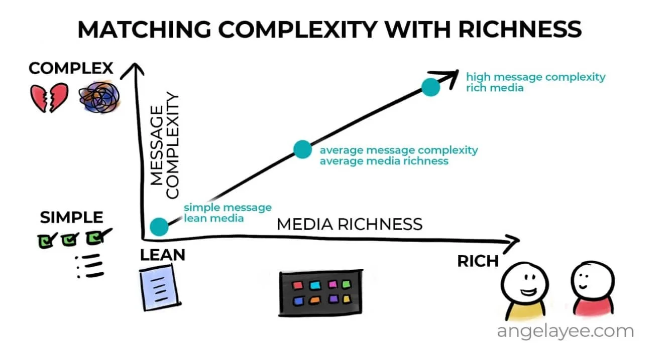 Thoughtful consideration of format = higher clarity and better response. Even more importantly, it can build trust and strengthen relationships when we are thoughtful about the context and nuance. Here’s a 2 x 2 to help you discern if a communication should be shared async and if so, through which async medium. Note the emphasis on the strength (richness) of the relationship below (Image credit: Angela Yee). The idea here is that if it's less complex, you can use something like email, text, Slack, etc, and if it becomes more complex move to voice memo and a video message. At some point you will realize it's so complex that it should be a synchronous meeting.