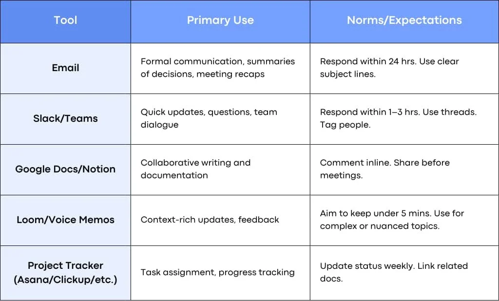 Asynchronous norms also build trust. A study on remote productivity found that when leaders consistently share written updates and model transparency, team cohesion improves, even across locations or time zones.